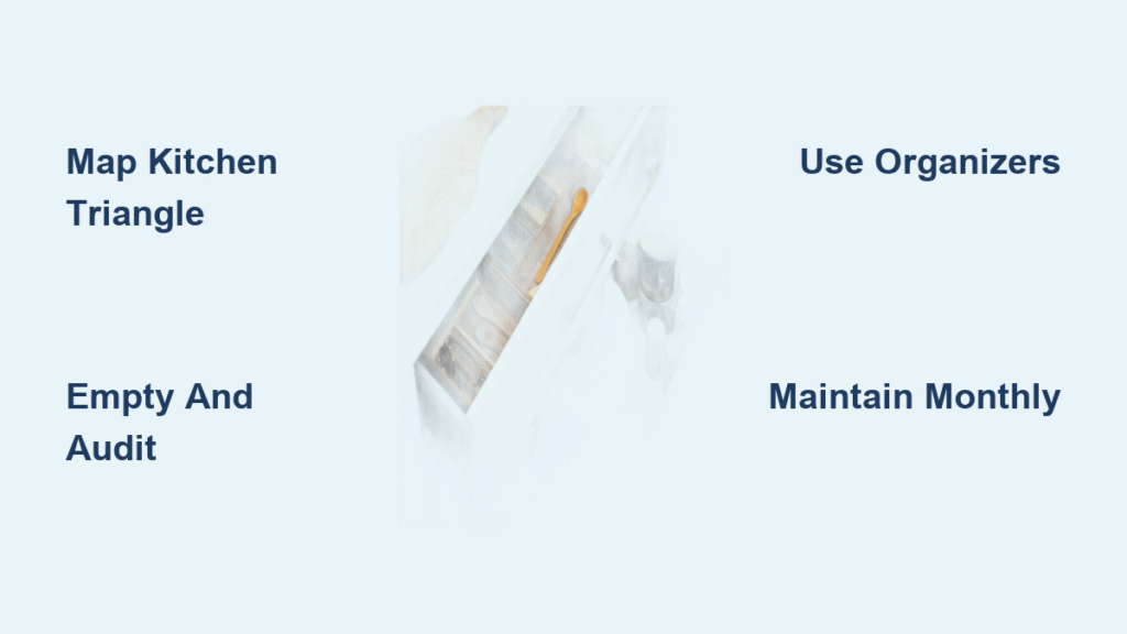 Before touching a single organizer, grab a piece of paper and sketch your kitchen’s three power points: stove, sink, and refrigerator. Your most-used drawers should sit within this triangle—ideally no more than 26 feet total walking distance between all three points. Most chaotic kitchens violate this fundamental rule, forcing you to zigzag across the room mid-cooking.