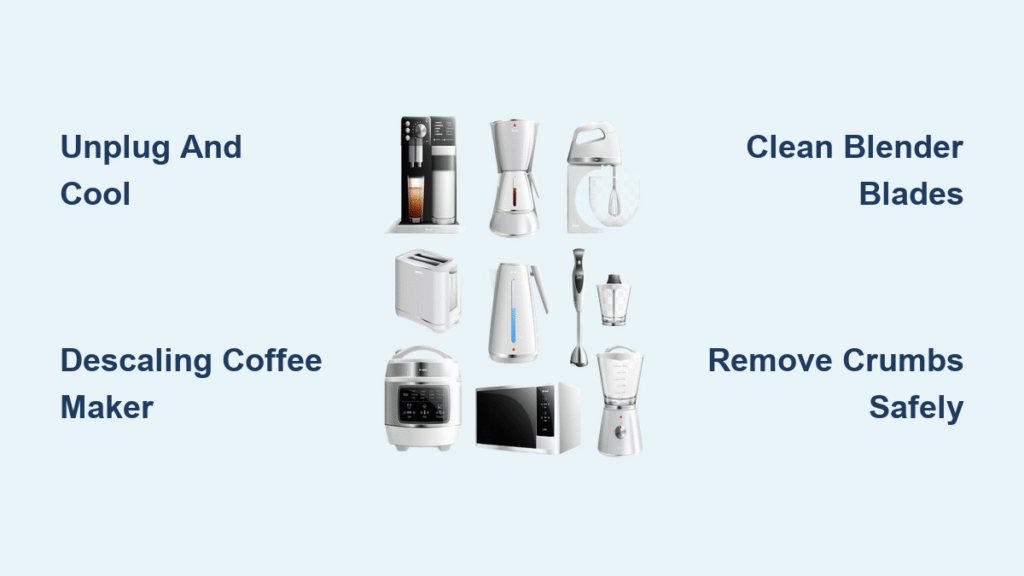 Your morning coffee tastes bitter. Your blender leaves a sour smell after smoothies. That toaster spills more crumbs than a bakery. These daily frustrations stem from one overlooked habit: neglecting small appliance maintenance. When grime builds up in hidden crevices and heating elements, performance plummets, food safety risks increase, and appliances die prematurely. The fix? A targeted cleaning system that takes minutes but extends appliance life by years. This guide delivers exact methods for every countertop device—no guesswork about what’s dishwasher-safe or which parts need vinegar soaks. You’ll learn why filtered water prevents 60% of coffee maker failures and how to dissolve stubborn residue without damaging non-stick coatings.