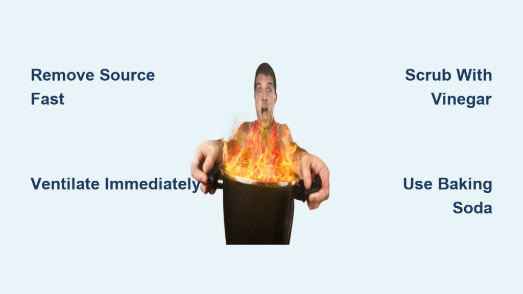 Critical first step: Physically remove the burnt item from your home within 2 minutes. Hot debris continues emitting odor molecules for hours, turning a localized problem into whole-house contamination. Never toss smoldering food in your kitchen trash can—it transforms your entire cabinet into an odor emitter.